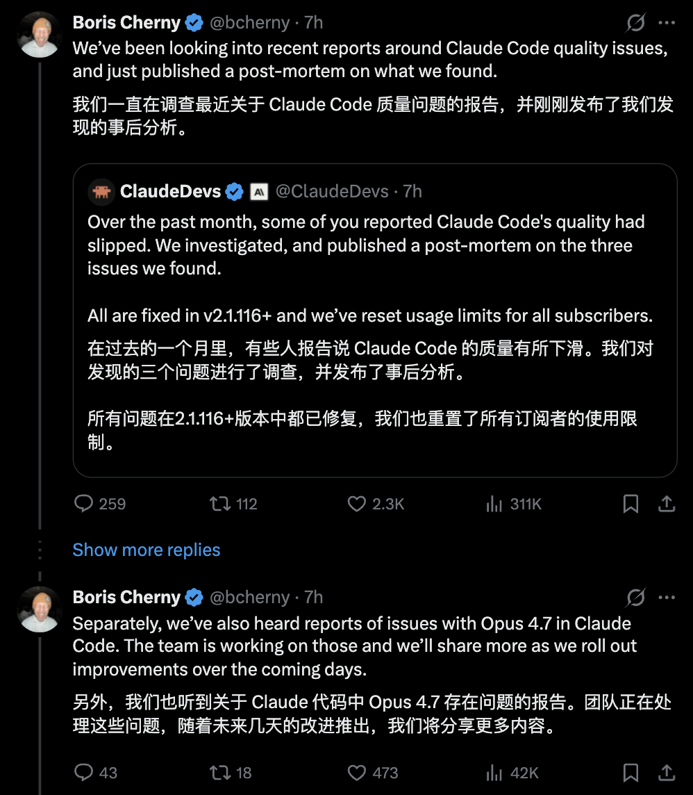 官方推特上,ClaudeDevs发总结,Claude之父Boris Cherny也亲自下场回复,并预告Opus 4.7的bug也正在de了。