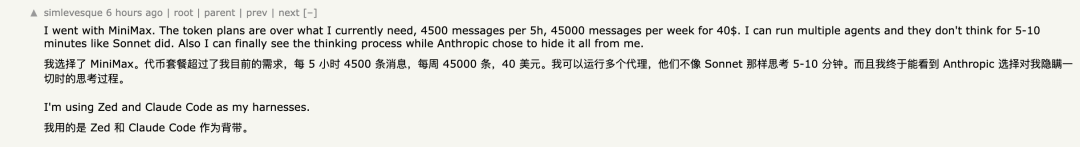 还有人在用MiniMax做补充,40美金4500条消息一个5小时周期,还能看到完整思考过程。