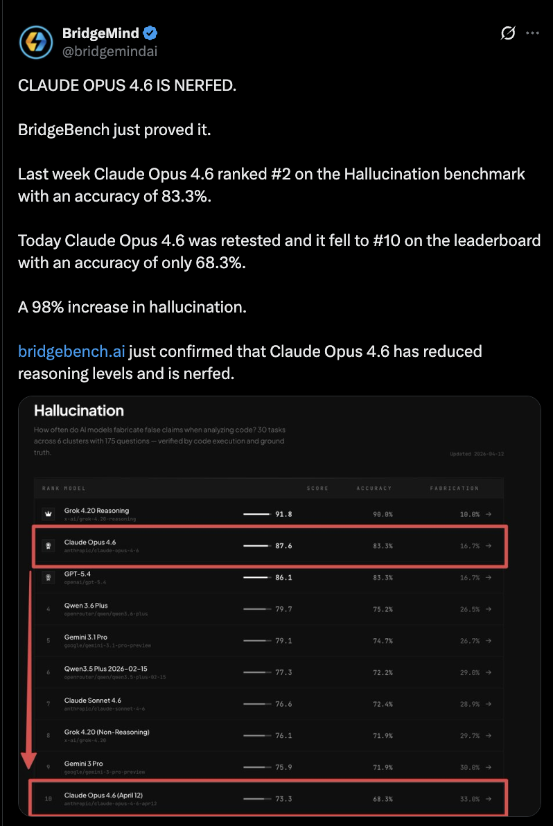 BridgeMind的BridgeBench测试也在这段时间炸了锅,显示Opus 4.6准确率从83.3%掉到68.3%,排名从第2跌到第10。