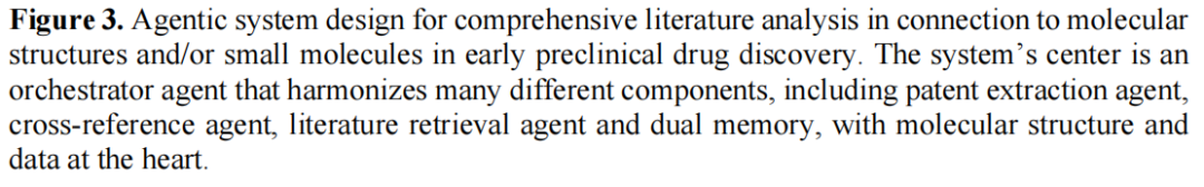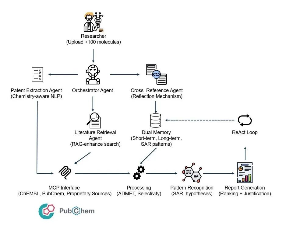 • 专利提取智能体:基于化学感知NLP和RAG增强检索,提取SAR数据 • 文献检索智能体:通过语义搜索采集ADMET属性数据 • 交叉引用智能体:通过比较分析识别数据冲突