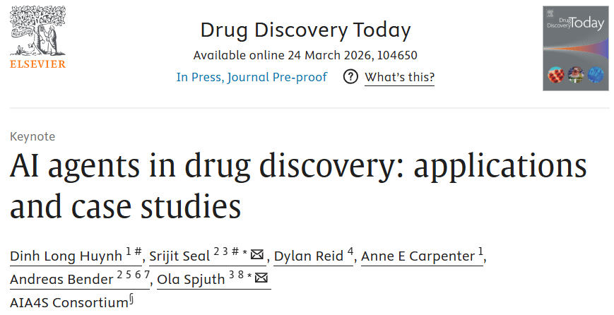 文献来源:Huynh DL, Seal S, Reid D, et al. AI agents in drug discovery: applications and case studies. Drug Discovery Today, 2026. DOI: 10.1016/j.drudis.2026.104650