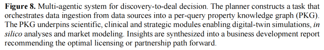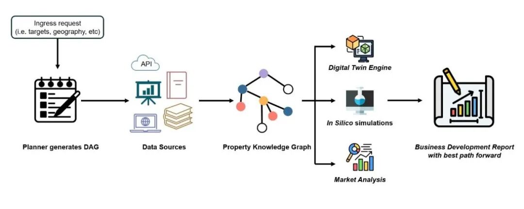 构建每查询专属属性知识图谱(PKG),所有模块共享访问• 科学评估:结合基于物理的模拟与ML模型,预测不一致时标记不确定性 • 临床模块:利用历史试验数据和真实世界数据预测风险 • 市场与商业模块:分析专利申请、监管备案和定价数据库 • 成功概率模块:综合前序模块输出,评分每个资产的临床成功可能性