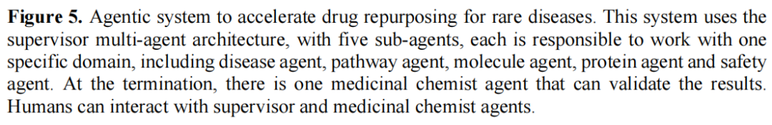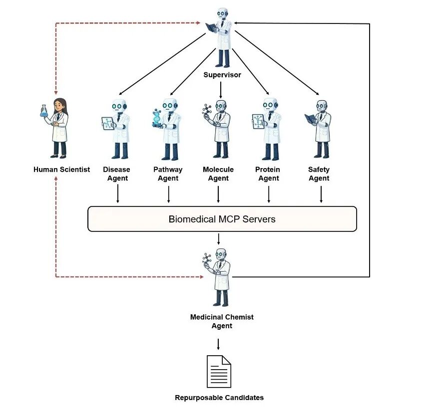 └── 安全智能体 → DrugBank + FDA数据库(毒性与ADMET过滤)最终由药物化学家智能体对输出进行验证,人类可与监督者和药物化学家智能体交互。