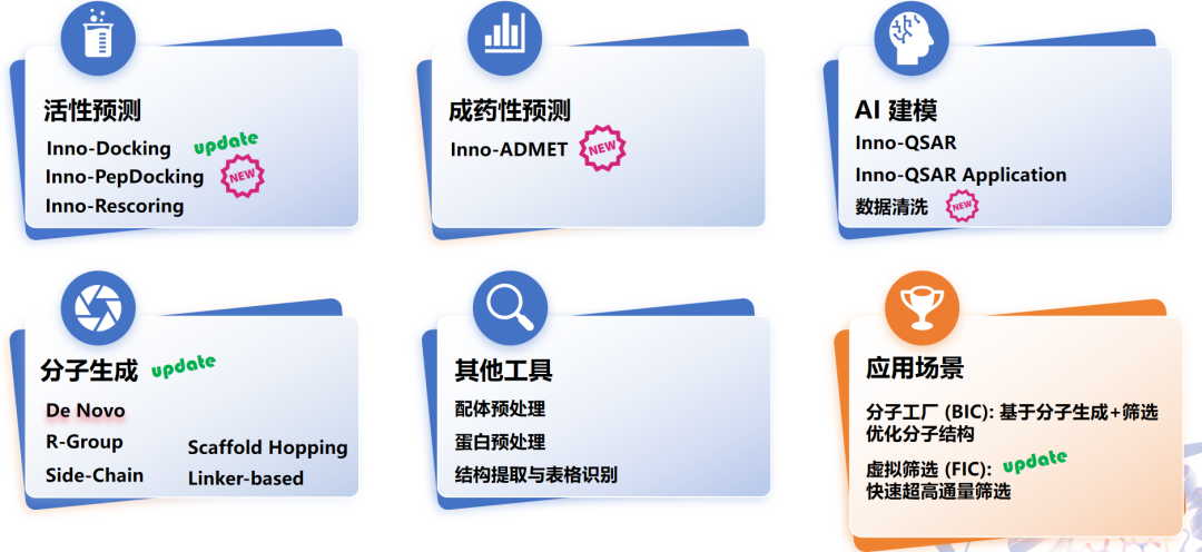 截至目前,DrugFlow已形成较为完整的平台能力体系,集成Inno-Docking、Inno-QSAR、AI Spectrum、Inno-Rescoring、Inno-ADMET、Molecular Factory、Virtual Screening、DataFlow以及Protein Preprocessing等多个核心模块,为药物研发提供从分子生成、虚拟筛选到成药性评估的系统化支撑。在本次更新中,DrugFlow围绕用户体验、算法性能和底层数据库资源进行了全面优化。首先,平台用户界面完成全新升级,显示效果与交互体验进一步改善,操作效率明显提升;其次,分子工厂模块实现算法升级,分子生成速度更快、设计准确性显著增强;同时,虚拟筛选实体化合物库拓展至近3000万,平台化学空间覆盖能力得到持续增强。其次,DrugFlow还新增了QSAR数据清洗、可为模型训练和预测提供更高质量的数据基础;同时新增基于CarsiDock-Cov算法的共价对接算法,实现兼顾速度、准确性与自动化的共价对接解决方案;柔性对接则基于Boltz-2算法,能够更精准捕捉受体构象变化,在保持较高精度的同时进一步提升计算效率。此外,平台即将上线的Inno-ADMET 3.0成药性预测模块也成为此次更新的一大亮点。该版本将预测终点扩展至119个,训练数据规模超过40万条,完成模型架构全面升级,并引入量子化学信息和不确定性评估功能,从而为用户提供泛化性更好、更准确、更可靠的ADMET预测与决策支持。二、BioFlow
