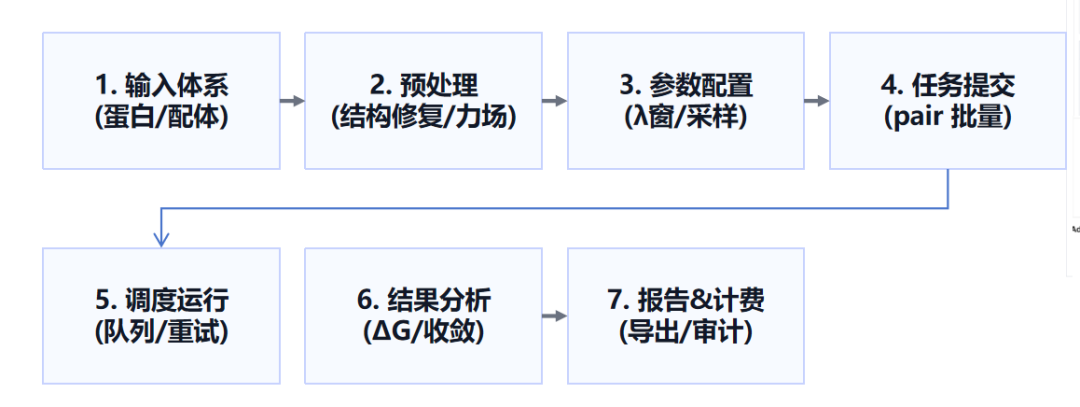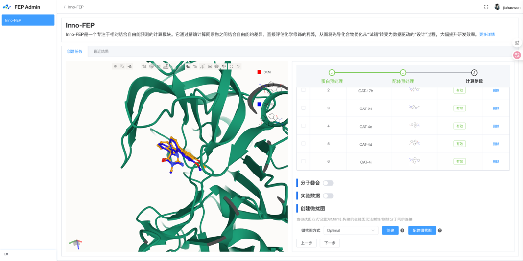 结构预测与多维互作建模:依托Boltz-2等前沿模型,平台提供大分子的领域高精度结构预测(Inno-StructGen),并完整集成了多肽-蛋白(Inno-PepDocking)及蛋白-蛋白(Inno-ProtDocking)的高效对接与多维质量评估体系,满足复杂蛋白互作研究需求。深度生物学洞察与生成式设计:在结构解析之外,平台进一步打通了蛋白翻译后修饰(Inno-PTM)与免疫表位预测(Inno-ImmunePred)。在设计环节,BioFlow全面引入ODesign与LigandMPNN等生成式AI能力,实现对关键表位的精细控制、结构引导设计与序列优化,推动大分子研发正式迈向可控的“理性设计”新阶段。三、Inno-FEP