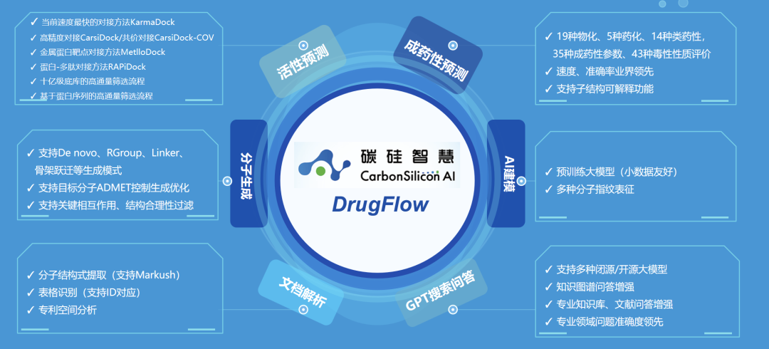 DrugFlow是由碳硅智慧研发的AI驱动的一站式创新药发现平台,核心算法均具有自主知识产权,以SaaS或混合云方式提供给第三方客户使用。DrugFlow涵盖靶标发现,苗头化合物发现和先导化合物优化等环节,集成世界领先的靶标发现、活性预测、成药性预测、分子生成优化、虚拟筛选、AI建模、结构式及表格提取、蛋白预处理等模块,帮助药化专家更高效便捷地找到潜在成药分子。DrugFlow努力打造覆盖药物研发完整流程的软件平台,基于自动化硬件产生的数据迭代模型,并将专家融合到流程中,最终形成数据驱动人机协同的统一设计平台,显著提高药物研发的确定性。