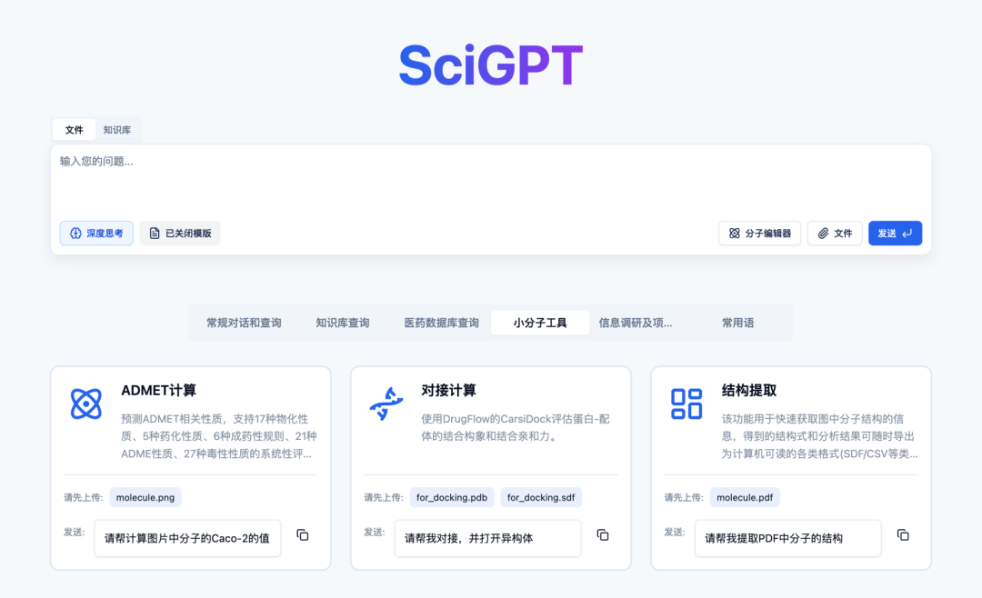 在小分子药物优化阶段,结合自由能计算(FEP)是最具预测价值的关键技术之一。作为本次发布的核心能力,Inno-FEP通过算法创新与工程体系重构,成功将自由能计算从“高精度专家工具”转化为真正的“工业化生产力”。平台基于分子动力学模拟,支持从分子预处理到ΔG计算分析的全自动化执行,极大降低了使用门槛。首先,平台首创自适应Lambda调度机制,显著提升复杂体系收敛速度;突破性支持环系跃迁、电荷变化等全场景复杂分子变换;同时依托自研GRASP力场与工业级稳健性架构,配合端到端自动化流程,保障了高通量筛选的大规模、高成功率稳定运行。其次,在Benchmark验证中把握准确性与效率的平衡。在多组公开数据集与内部测试中,Inno-FEP展现出极具竞争力的性能表现,案例数据如下:TYK2抑制剂体系:16个化合物,R² = 0.91,RMSE = 0.64Thrombin抑制剂体系:11个化合物,R² = 0.90,RMSE = 0.56在更大规模的基准测试中,平台单pair端到端计算耗时P50 < 8小时,P90 < 24小时;任务成功率高达约97%;吞吐量随GPU资源实现近线性增长。未来,Inno-FEP还将持续扩展ABFE、HFE等新能力,进一步释放高精度计算的产业决策价值。四、SciGPT及医药数据库
