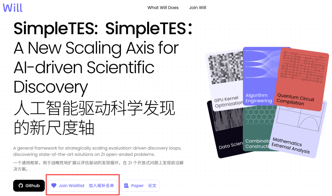 目前,基于 SimpleTES 方法构建的试用平台已经在Will官网上线,前往申请加入就能体验这一全新的科学范式。