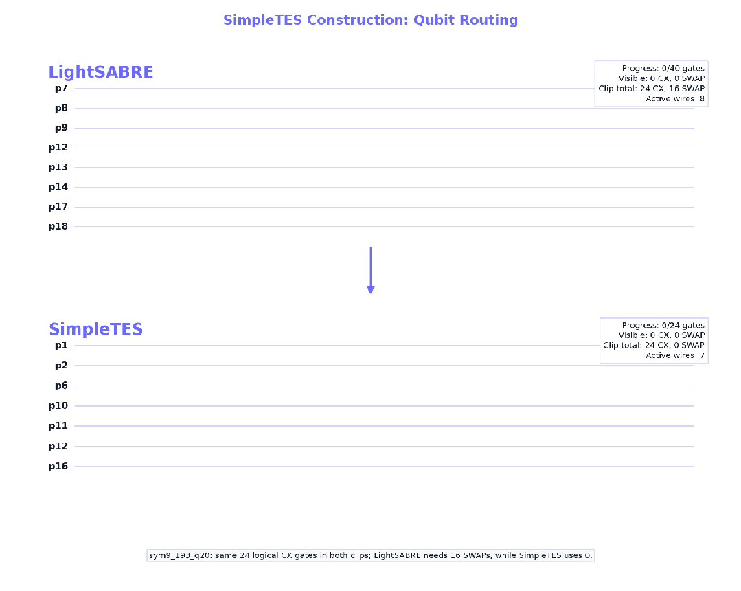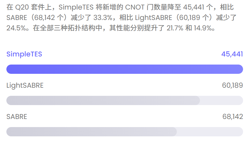 在超导量子计算机架构上,SimpleTES发现的量子比特路由策略,直接把金标准SABRE算法超了21.7%,改进版LightSABRE也被甩开14.9%。