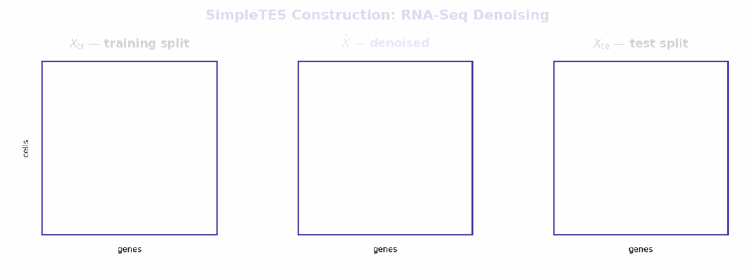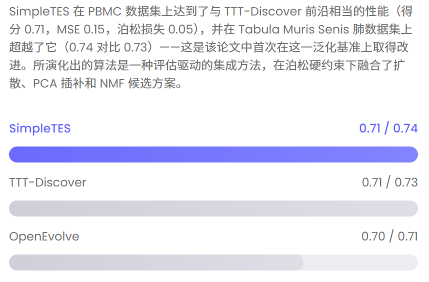 SimpleTES在单细胞RNA测序去噪任务上,发现的集成去噪算法超越前SOTA,且能泛化到未见过的组织类型。