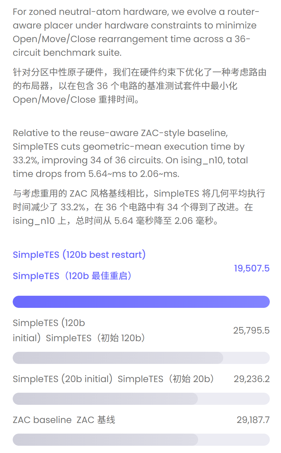 换到中性原子架构上照样能打——36个测试电路里改进了34个,平均执行时间降了33.2%。