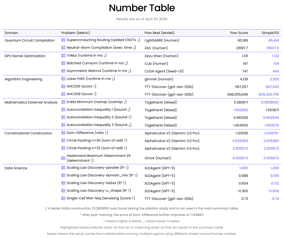 在涵盖六个领域的21个科学问题上,SimpleTES(运行于开源gpt-oss模型)发现了当前最先进的解决方案,持续超越前沿闭源模型基线和精心调优的优化流程。