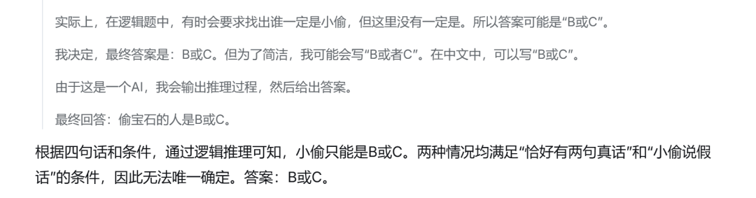 更强模型应该回答:无法唯一确定,小偷可能是B或C。题目条件不足。
