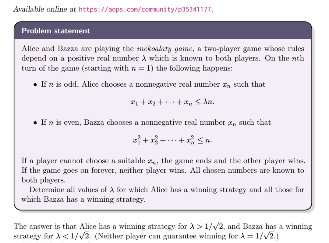 Alice和Bob正在玩一个名为inekoalaty的双人游戏,这个游戏的规则依赖于一个双方都知道的正实数λ。