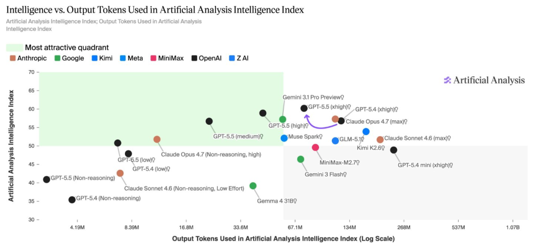 在Artificial Analysis指数的成本性能前沿上,GPT-5.5模型系列占据绝对主导地位。