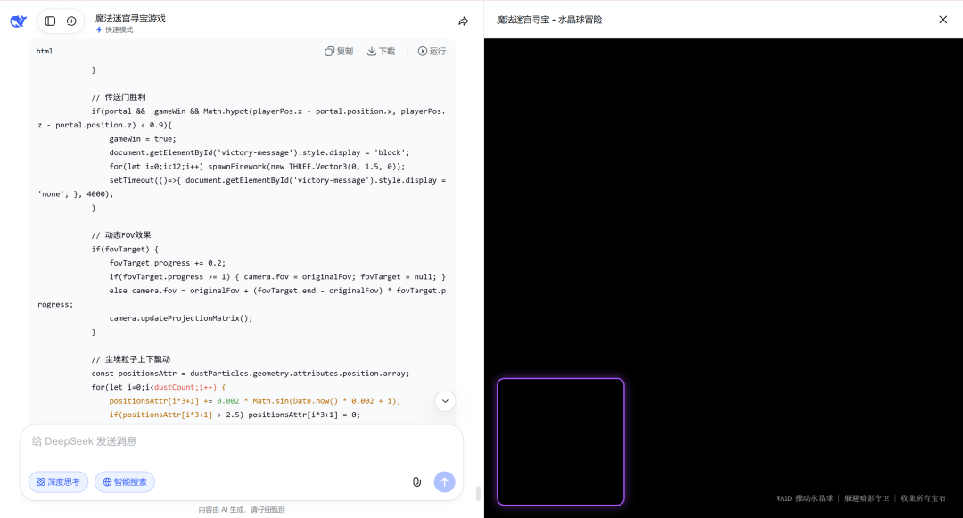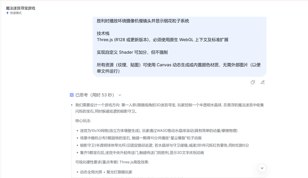 通过最终呈现,可以清晰对比两个模型在2D细腻特效与3D场景构建、光照与实时粒子系统方面的代码生成能力、架构合理性以及视觉审美水平。