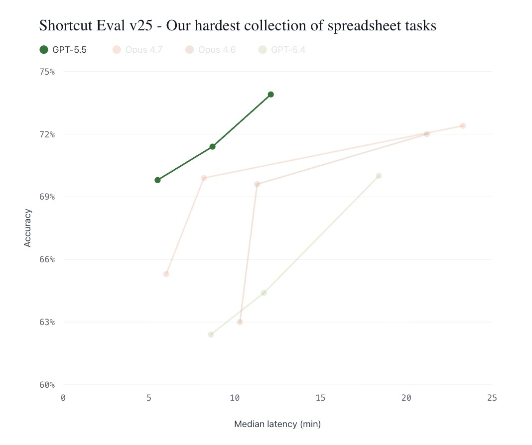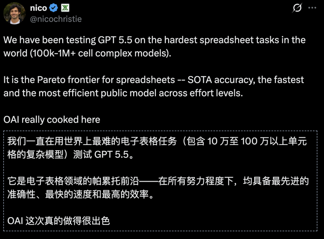 在世界上最难的电子表格任务上,GPT-5.5实现全新SOTA:速度最快、效率最高。