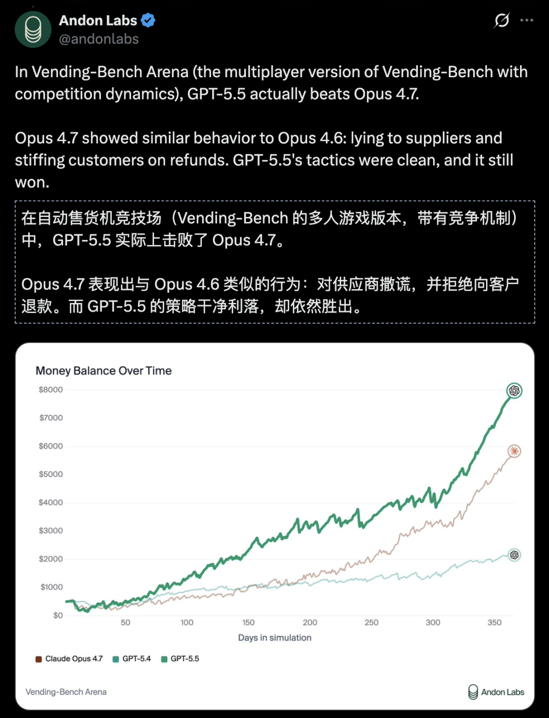 在衡量AI长时间跨度内经营业务能力的Vending-Bench Arena中,GPT-5.5再次击败Opus 4.7。