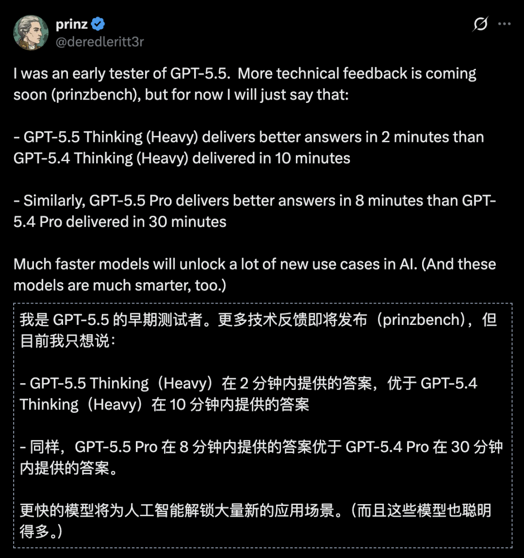 GPT-5.5 Thinking Heavy模式,2分钟出的答案,比GPT-5.4 Thinking Heavy花10分钟出的更好。