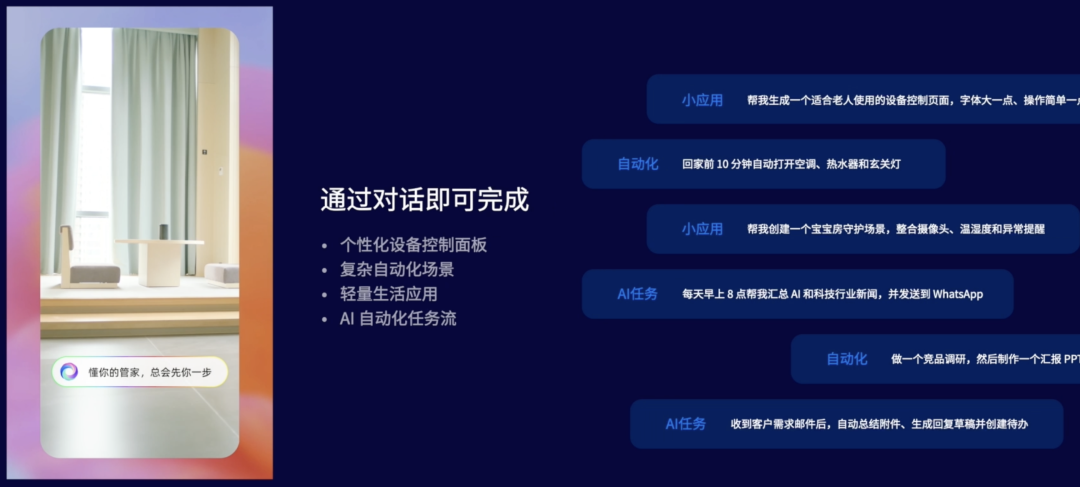 区别于传统固定自动化流程,所有场景逻辑都会结合用户作息习惯、个人偏好与实时状态动态生成。