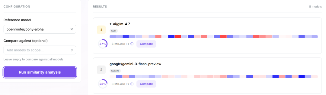 结果显示,在候选模型中,pony-alpha与z-ai/glm-4.7的DNA相似度最高,显著高于Gemini等其他模型;从功能行为表征的角度看,这一结果为其可能属于 GLM 谱系提供了较强线索。