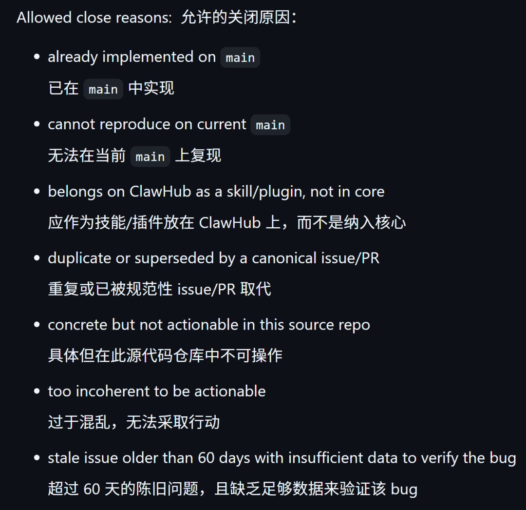它只在以下7种情况下才会关闭一个Issue::已经在 main 实现、当前 main 无法复现、应归属 ClawHub 的 skill/plugin 而非 core、重复或已被更权威条目取代、在该仓库内具体但不可执行、内容过于混乱不可执行、以及超过 60 天且缺少足够数据验证 bug。