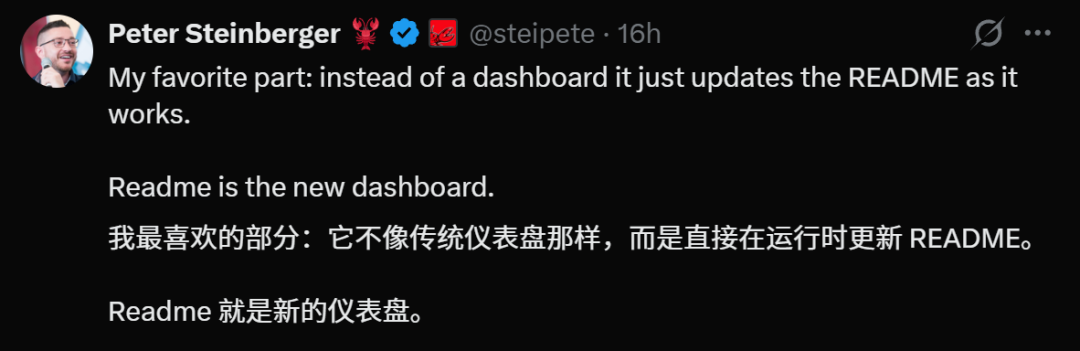 Steinberger说:不需要。README就是我的仪表盘。