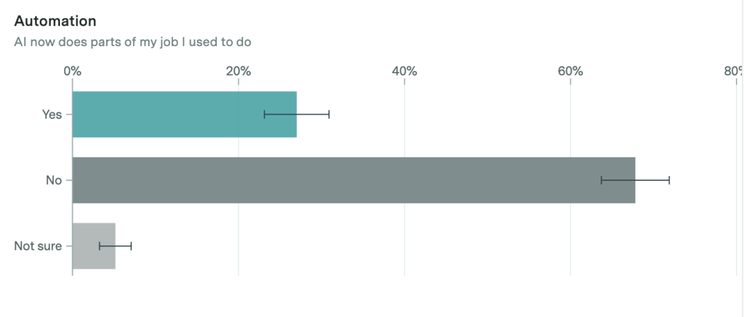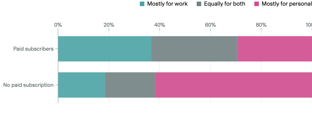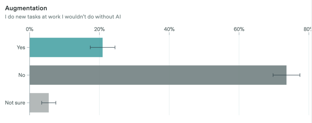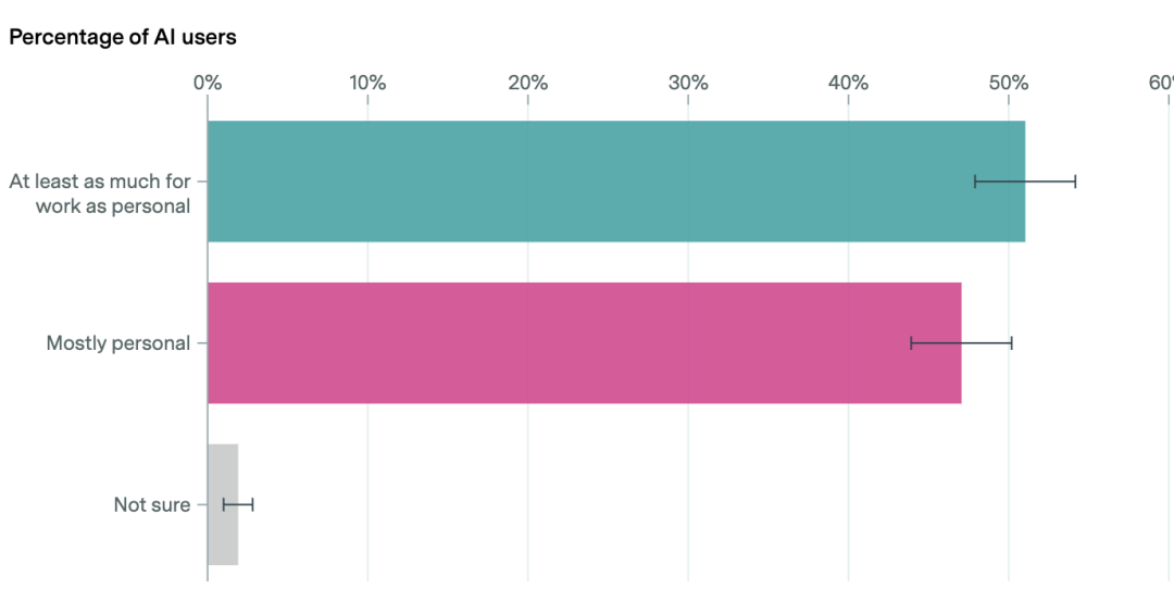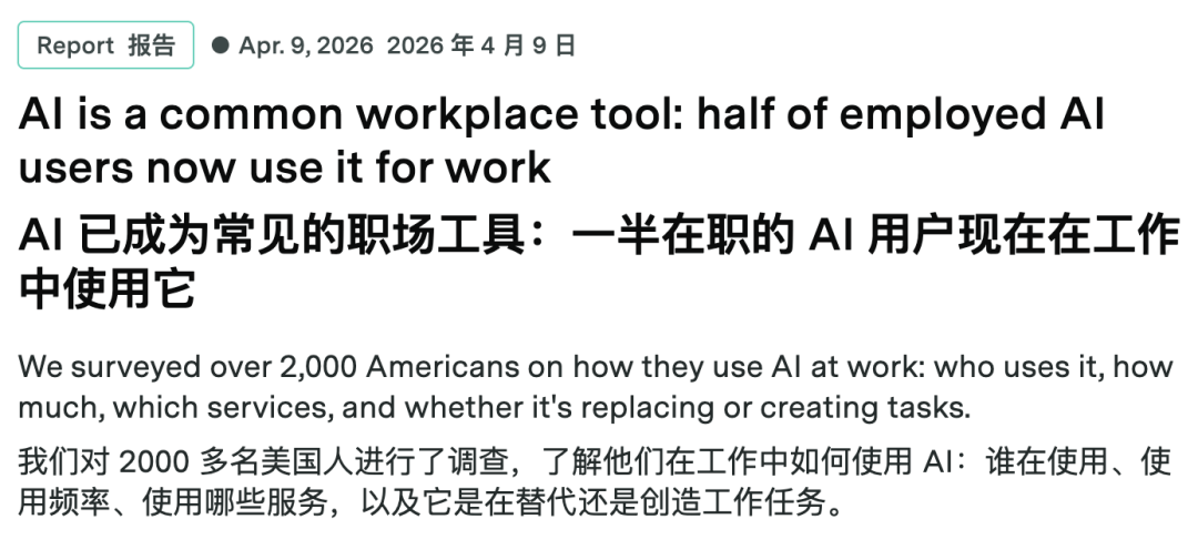 多数人都会纠结。20美元不是付不起,但它代表一种实验成本——出了问题自己兜着,省了时间老板也看不见。Epoch AI联合Ipsos发布的一项全国性调研发现,在使用免费版AI工具的职场人中,把AI用于工作的比例只有38%;自费订阅的用户升到58%;而公司买单的用户,这个数字直接拉到76%。50%的美国人用了AI,但大多数人只是「浅尝辄止」50%,这个数字初听起来很炸裂——美国一半成年人都在用AI了?但别急着兴奋,往下看会发现,大部分人的用法还停留在相当轻量的阶段。在使用最密集的那一天,62.5%的人也只完成了一到两个快速任务。真正的重度用户,也就是那种用AI处理大量工作的人,只占大约6%。用途也很集中。80%的AI用户拿它查信息、找推荐;59%用来写作或编辑文本;55%用于学习或咨询;53%拿来做头脑风暴。在使用过AI的职场人中,51%的人把AI用于工作的频率已不低于个人用途(青色),47%仍以个人用途为主(粉色)。AI正从消遣工具向生产力工具切换。AI现在最大的角色还是一个更聪明的搜索引擎+写作助手,大多数人并没有把它当成一个改变工作方式的工具。27%的职场AI用户说旧任务被接管,21%说打开了新任务调研问了一个关键问题:AI有没有改变你实际在做的工作?27%的人说,AI已经替代了他们原有的部分任务:总结文件、整理信息这类事情,现在交给AI做了。「AI现在在做我以前做的工作」——27%的职场AI用户给出了肯定回答(青色),近68%表示尚未受到影响。21%的人说,AI让他们开始做一些以前做不了的新任务:原本需要编程才能完成的数据分析,现在靠AI就能搞定。1%的职场AI用户表示AI拓展了他们的能力边界(青色)。与上图对照:替代(27%)略高于增强(21%),但两者正在同时发生。其中有13%的人同时经历了两者:旧任务被接管,新任务被打开。那27%里面,有相当一部分人只经历了任务被拿走,并没有获得新的任务作为补偿。他们的工作内容在「缩水」。而那21%里面,将近一半的人是纯增量——原有任务没受影响,AI只是帮他们拓展了能力边界。这就形成了一个正在发生的职场分化:一部分人的工作护城河在被AI侵蚀,另一部分人则通过AI获得了某种「降维打击」的能力。高盛经济学家Elsie Peng提供了一个更宏观的视角:AI替代效应每月消灭大约2.5万个岗位,但增强效应又创造了约9000个岗位,净效果是每月减少约1.6万个工作机会。