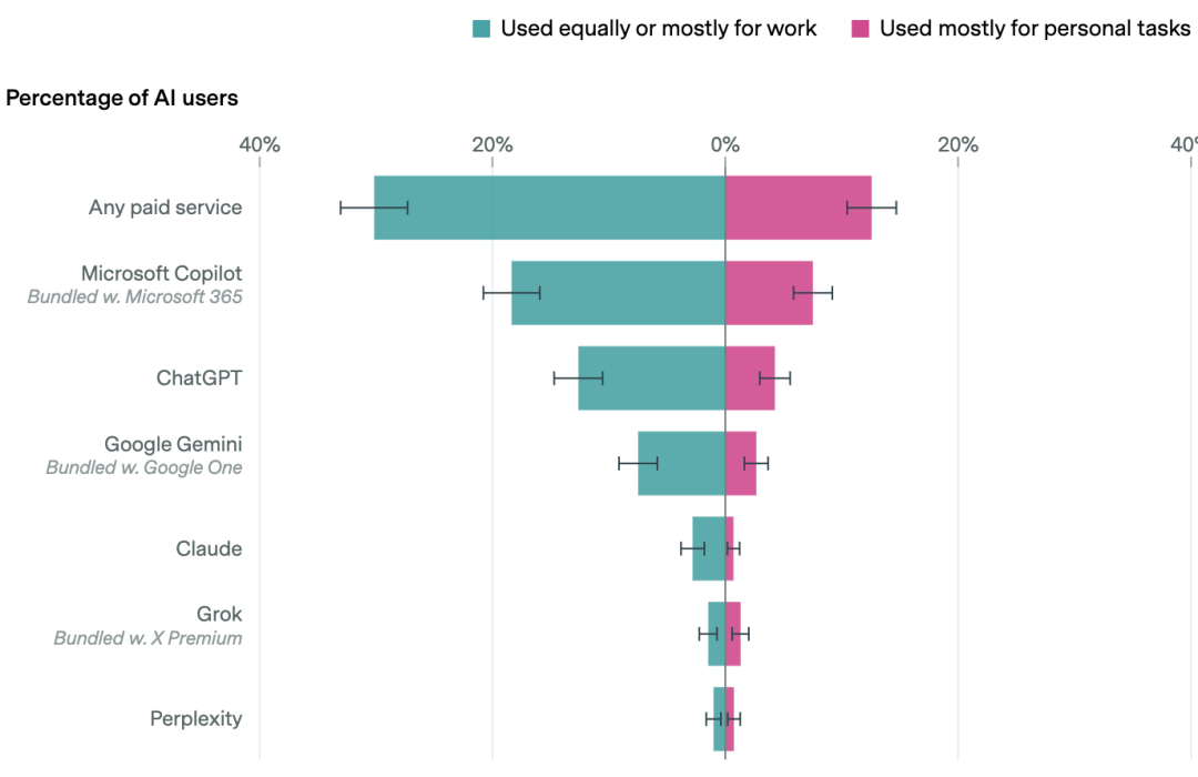 而且,这种冲击有明确的代际指向——Z世代和初级岗位首当其冲。数据录入、客服、法律辅助、账单处理……这些年轻人集中的常规白领岗位,恰恰是AI最擅长自动化的领域。免费用户中,只有38%把AI用于工作;自费订阅者升到58%;公司提供付费工具的用户,76%把AI用在了工作上。付费用户(含自费和公司买单)中,工作用途(青色+灰色)占比接近80%;而免费用户中这一比例仅约38%。进一步细分来看,自费订阅者为58%,公司买单用户高达76%。这不只是一个消费行为的差异,而是一个心理阈值的问题。当员工自掏腰包时,AI的使用带着一种隐性的「灰色地带」感:这算工作还是摸鱼?数据安全有没有问题?我用AI写的东西能不能直接交上去?但当公司掏钱、提供官方账号的那一刻,这些心理摩擦全部消失。AI获得了一种「制度性许可」——老板知道你在用,甚至希望你在用。这解释了一个长期困扰行业的问题:为什么AI工具的个人试用率很高,但企业级渗透率迟迟上不去?调研还揭示了另一个值得注意的现象:在职场使用AI的人中,50%仍然依赖个人订阅或免费版本,只有33%使用公司提供的AI服务。这意味着,大量员工在用自己的工具、自己的账号、自己的数据,做着公司的工作。这对企业来说是一个巨大的盲区。他们甚至不知道自己的员工正在用什么AI工具处理什么数据。在总体使用率上,ChatGPT以31%遥遥领先,Google Gemini 21%紧随其后,Microsoft Copilot 11%,Meta AI 8%。各AI工具的工作用途(青色,左侧)与个人用途(粉色,右侧)对比。Copilot的工作用途占比在所有工具中最高。在付费AI工具的职场使用率上,Microsoft Copilot排名第一,ChatGPT退居第二,Google Gemini第三,Claude第四。Copilot在职场翻盘的原因不是它背后的模型比GPT更聪明,而是因为:61%的Copilot用户是在Word、Excel和Teams里面直接调用它的。它不需要你切屏,不需要你打开一个新标签页,不需要你复制粘贴。相比之下,ChatGPT再强大,对打工人来说也是一个需要「额外操作」的外挂工具。而Copilot是内嵌的。这个逻辑和当年IE浏览器打赢Netscape道理相似。不是IE更好用,是它预装在每一台Windows电脑上。过去一周内,8%的AI用户使用过AI Agent。这个数字需要放在上下文里理解。AI Agent作为一个产品品类进入公众视野,满打满算也就是最近几个月的事。AI政策研究机构IAPS负责人Renan Araujo指出:每12个美国人里就有1个使用过能够代替自己采取行动的自主AI Agent。这种能力两年前根本不存在。