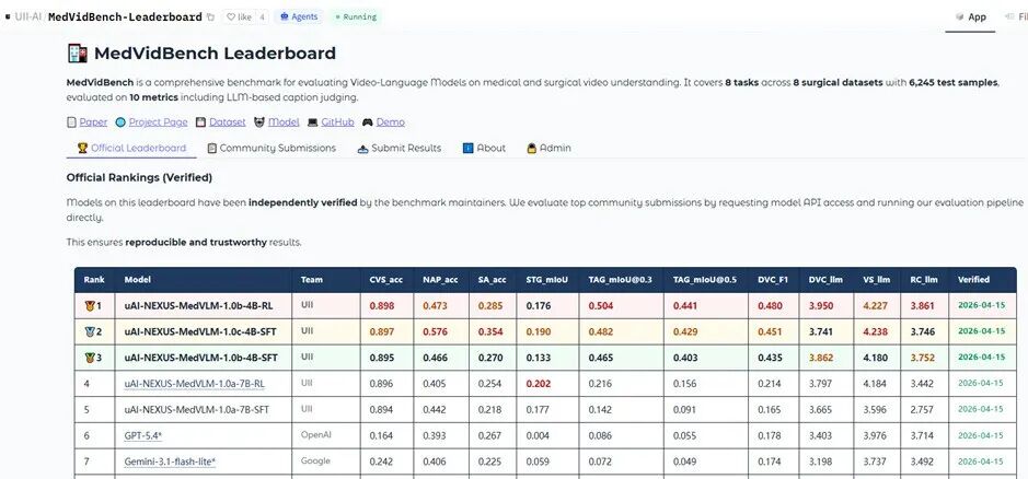 4.公开榜单: https://huggingface.co/spaces/UII-AI/MedVidBench-Leaderboard