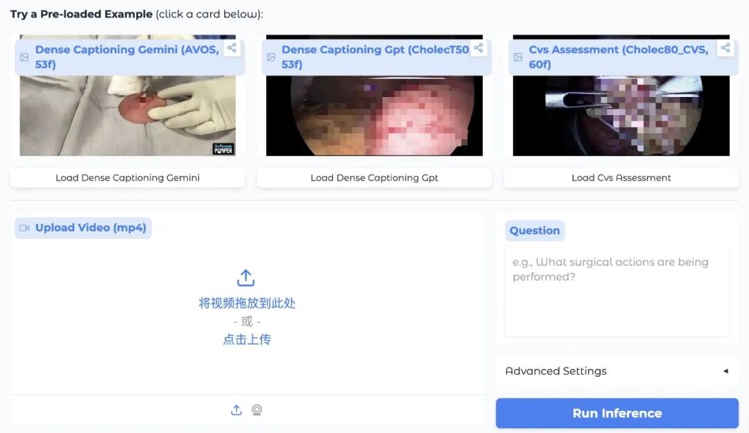 你可以上传自己的医疗视频,也可以用预置示例直接测试。