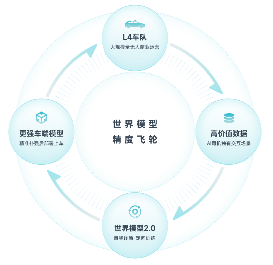 大规模L4无人车队商业运营,产生真实世界的高价值数据;世界模型据此提升精度;车端模型持续增强;更强的模型支撑更大规模部署;更大规模部署又产出更多高精度数据。