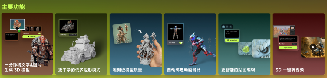 除了Meshy Creative Lab,Meshy平台还有一整套能力矩阵,包括文字图片转3D模型、自动绑定动画骨骼、3D一键转视频等。
