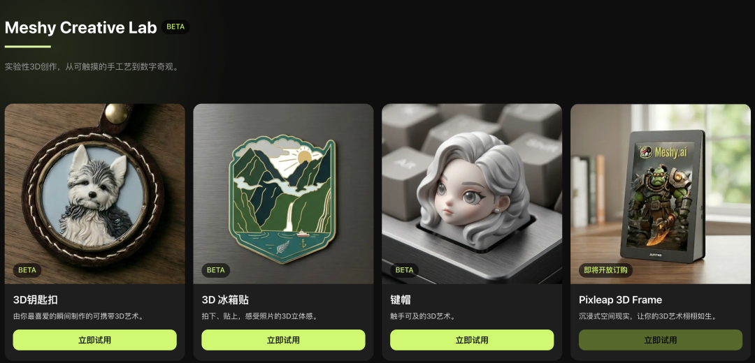 目前,Meshy创意工坊已开放3D钥匙扣、3D冰箱贴、键帽定制三大玩法,还有一款名为Pixleap 3D Frame的新玩法即将上线。