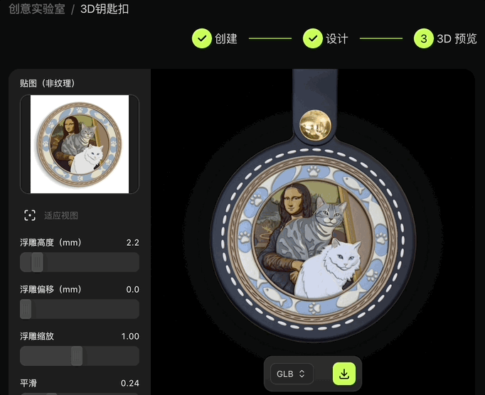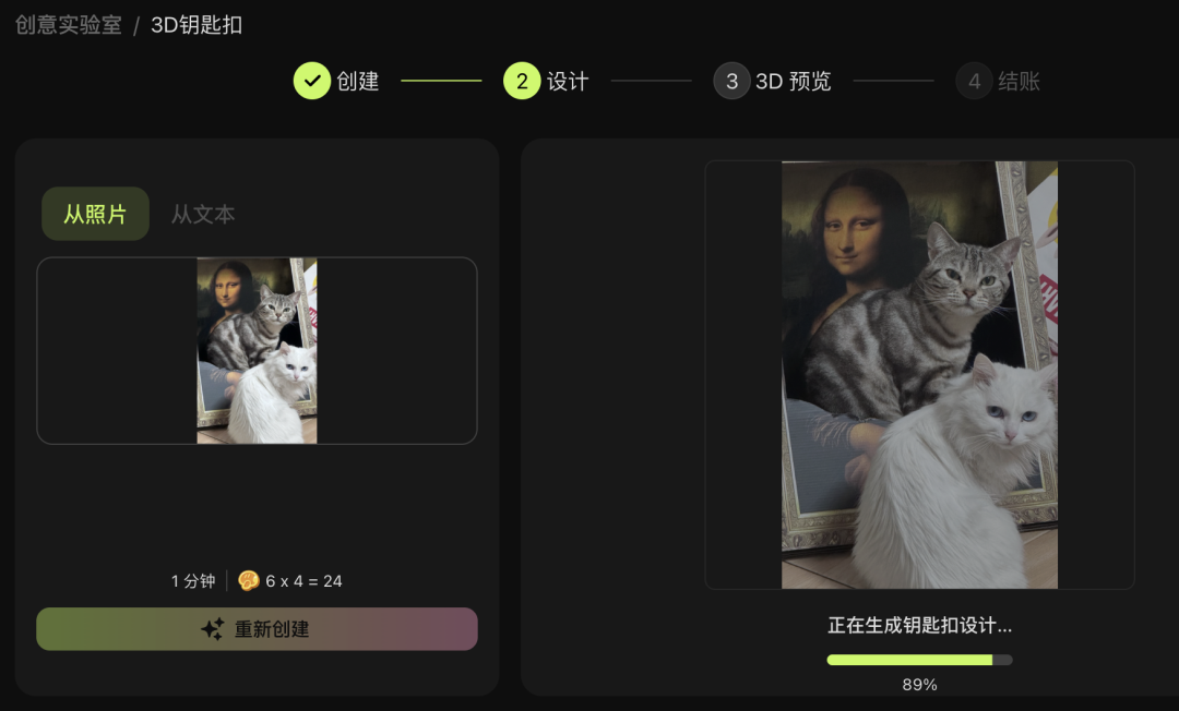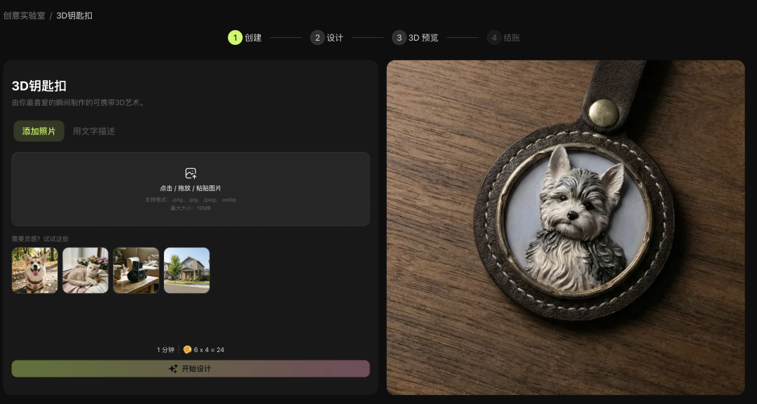 上传一张毛孩子的照片,点击“立即创建”,Meshy自动设计钥匙扣样图: