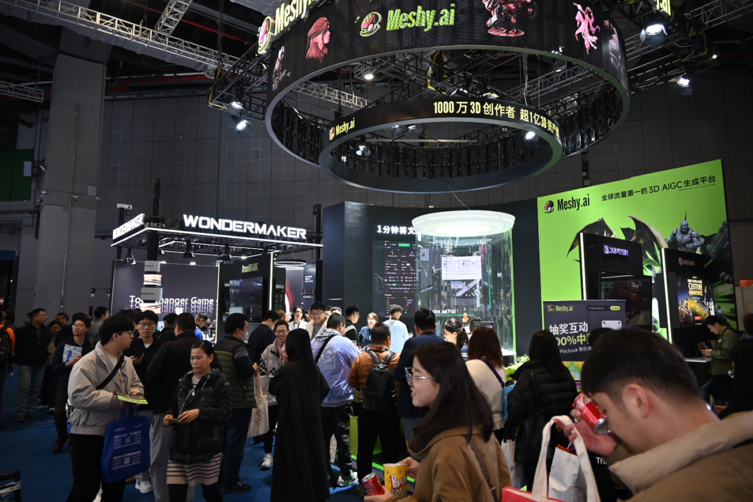 主角不是哪家3D打印机厂商。展台背后的名字叫Meshy,正是计算机图形学大神胡渊鸣创立的AI 3D公司。