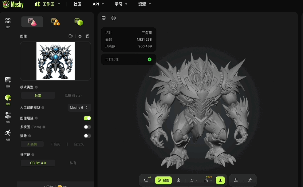 最后一点,正因为模型本身网格扎实、格式适配到位,Meshy的整体打印效率反而更高。不少工具看似30秒出模型,实则要花大量时间在建模软件里修复缺陷或是手动导入、格式转换等前置准备中。