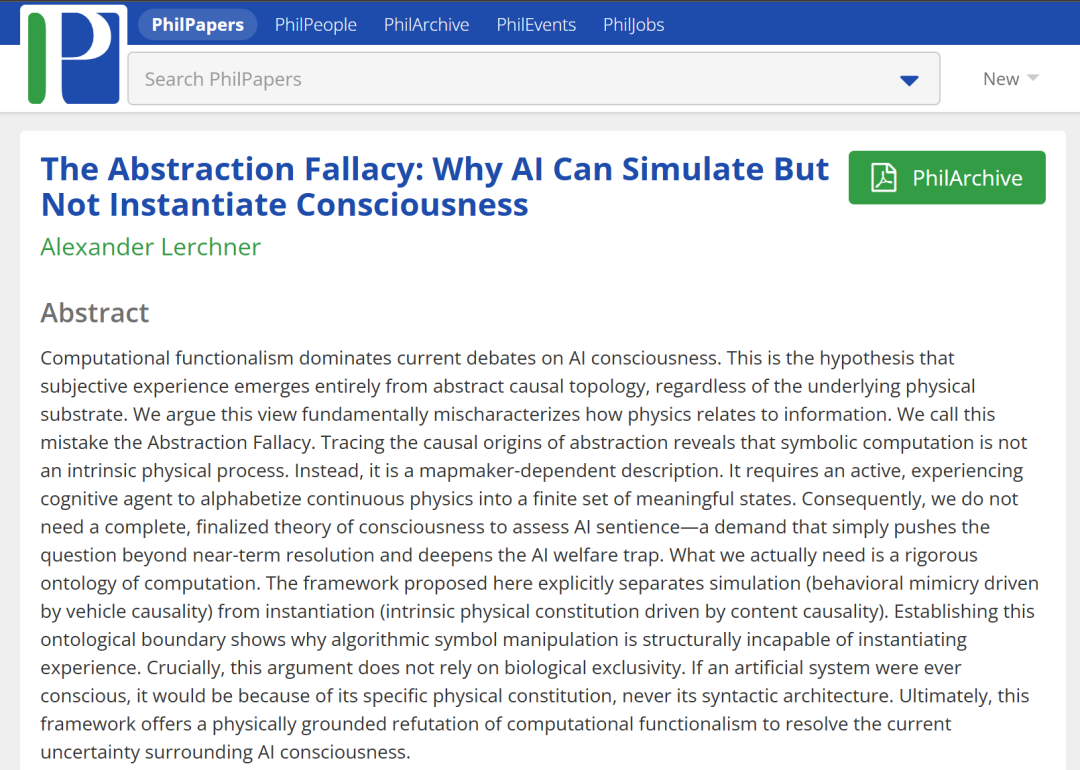 论文:The Abstraction Fallacy: Why AI Can Simulate But Not Instantiate Consciousness
