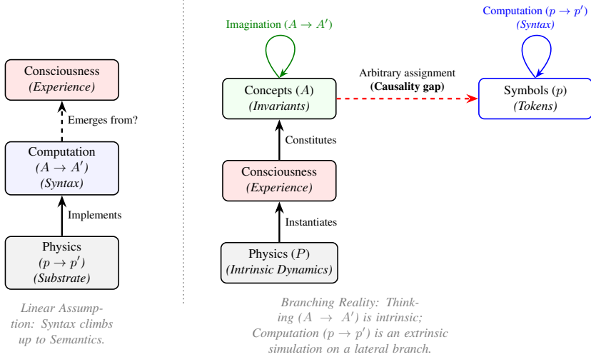 传统的计算功能主义认为:只要物理系统(比如大脑或芯片)的状态演变(p→p')符合算法逻辑(A→A'),那么意识就产生了。