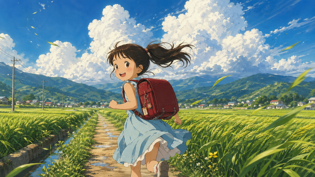 先来看个例子,原始视频中,小女孩背着书包沿乡间小路奔跑,再输入一张风格参考图。