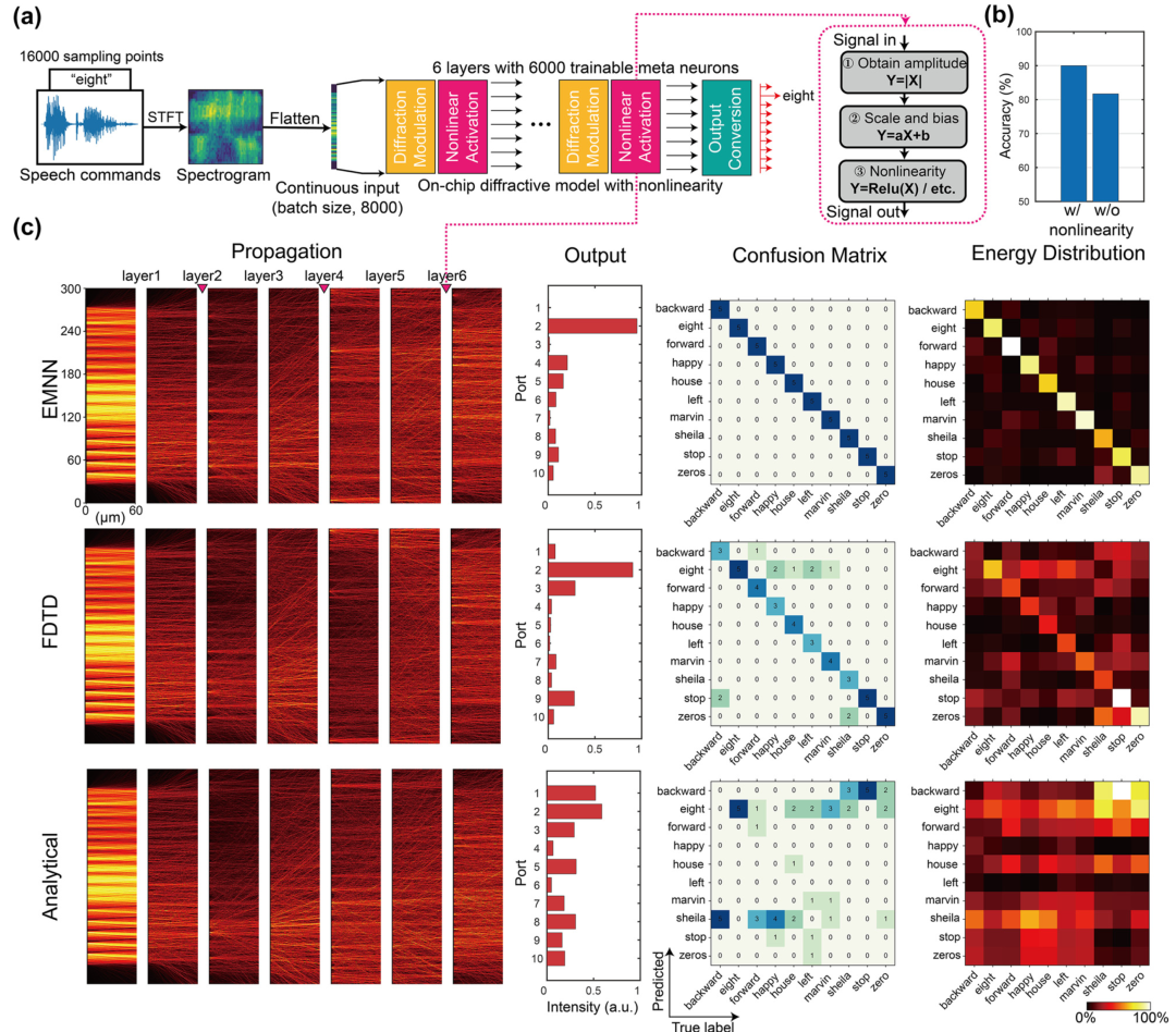 作者在设计中加入了非线性激活层(如利用材料的非线性克尔效应或探测器平方律),构建了一个更深层的网络来处理 Speech Commands Dataset(语音指令数据集)。