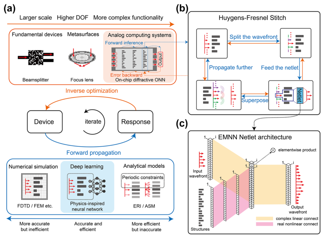 图1:传统逆向设计(a)面临精度与效率的权衡;而EMNN(b, c)通过物理启发的Netlet和拼接策略,实现了高精度、高效率且可扩展的设计。