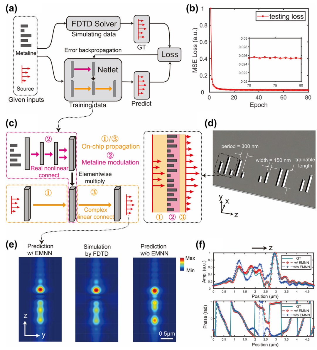 图2:(a)Netlet结构;(b)训练收敛曲线;(e)波前轮廓对比;(f)振幅与相位的量化对比。EMNN(蓝线)几乎与FDTD真值(红线)完全重合。