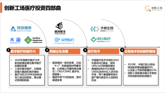 在这样的投资逻辑下,创新工场关注的细分领域主要有三个维度:一是关注数据和 AI 驱动、对医疗行业产生宏观影响的平台型科技企业;二是关注市场机制下分类人群的垂直服务升级的机会;三是聚焦医疗产品和服务的升级和突破等。