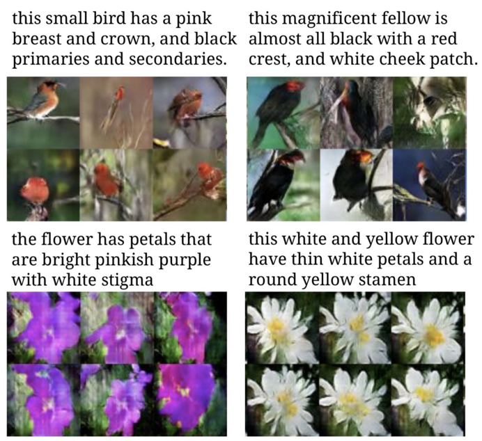 2016 这篇来自密歇根大学和Max Planck研究所的论文被OpenAI誉为振兴当前文本到图像生成研究的论文,该论文使用生成式对抗网络,即GANs来生成图像。GANs的功能是将两种算法对立起来。一个用来生成图像,另一个如果图像看起来不够真实,就拒绝它。