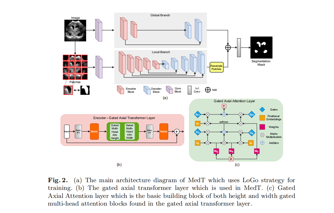 表现SOTA!并提出局部-全局训练策略(LoGo),进一步提高性能,优于Res-UNet、U-Net++等网络,代码刚刚开源! 在过去的十年中,深度卷积神经网络已被广泛用于医学图像分割,并显示出足够的性能。但是,由于卷积架构中存在固有的inductive biases,因此他们对图像中的远程依存关系缺乏了解。最近提出的利用自注意力机制的基于Transformer的体系结构对远程依赖项进行编码,并学习高度表达的表示形式。这促使我们探索基于Transformer的解决方案,并研究将基于Transformer的网络体系结构用于医学图像分割任务的可行性。提出用于视觉应用的大多数现有的基于Transformer的网络体系结构都需要大规模的数据集才能正确地进行训练。但是,与用于视觉应用的数据集相比,对于医学成像而言,数据样本的数量相对较少,从而难以有效地训练用于医学应用的Transformer。为此,我们提出了Gated Axial-Attention模型,通过在自注意力模块中引入附加的控制机制来扩展现有体系结构。此外,为了有效地在医学图像上训练模型,我们提出了局部-全局训练策略(LoGo),可以进一步提高性能。具体来说,我们对整个图像和patch进行操作以分别学习全局和局部特征。在三个不同的医学图像分割数据集上对提出的Medical Transformer(MedT)进行了评估,结果表明,与基于卷积和其他基于transformer的其他架构相比,它具有更好的性能。