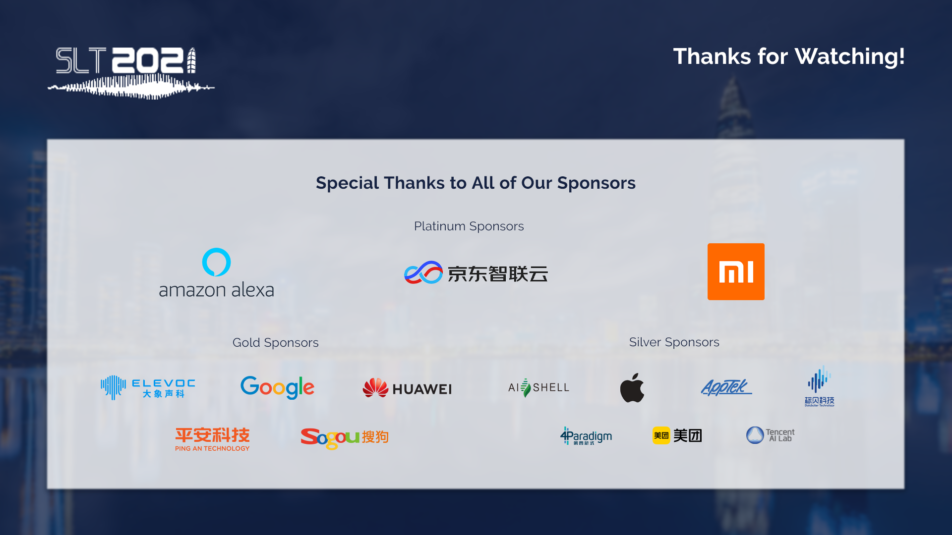 本届SLT得到了国内外多家知名企业的大力支持和热情赞助,包括白金赞助商(Amazon、京东、小米)、金牌赞助商(大象声科、Google、华为、平安科技、搜狗)、银牌赞助商(AISHELL、苹果、AppTek、标贝科技、第四范式、美团、腾讯AI Lab)。
