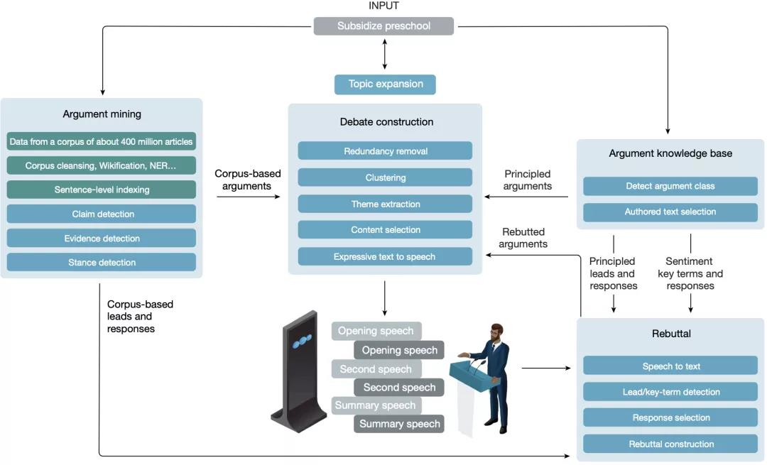 来自 IBM 的 AI 研究团队报告了一项最新的研究进展:Project Debater(意为 “辩手项目”),经评估,该系统已可以与人类专家选手进行体面且有意义的现场辩论,它能通过储存了 4 亿篇新闻报道和维基百科页面的知识库,自行组织开场白和反驳论点。