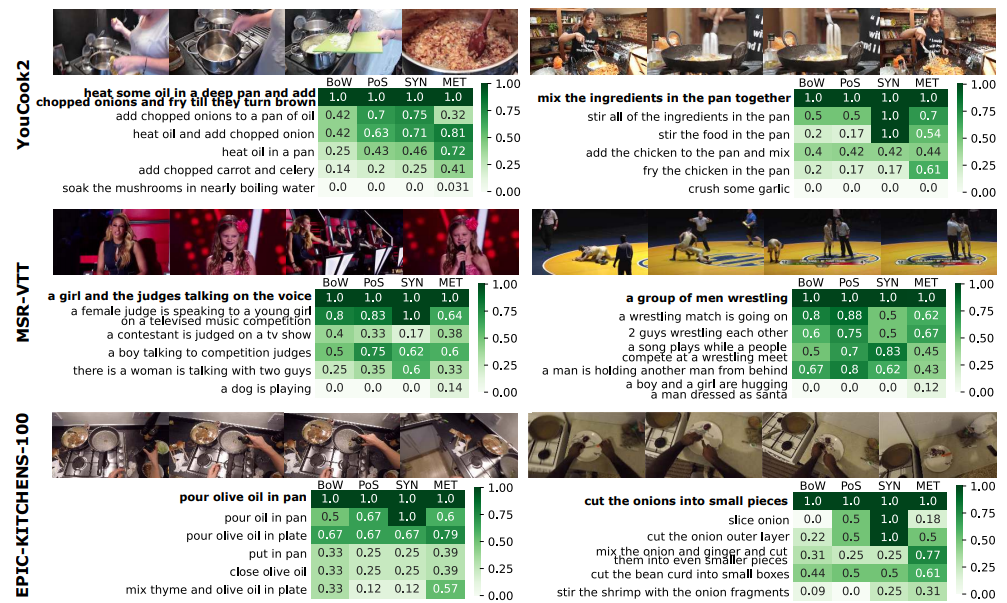 目前,有关视频检索的研究工作大多数都是在一种基于实例的假设之上来发现其评估结果,即只有一个图像的描述与查询视频相关,反之亦然。 在本文中,作者证明上述假设会导致对性能的比较往往并不能说明模型检索能力。作者建议人们转而使用语义相似度视频检索,这种方法具有以下特性: (1)多个视频/字幕可以被认为是同等相关的,它们的相对排名不影响方法报告的性能。 (2)根据与查询的相似度对检索到的视频/图像描述进行排名。 本文作者提出了多种任务在不需要额外标注的前提下,估计大规模检索数据集的语义相似性。此外,作者在三个常用的视频检索数据集(MSR-VTT, YouCook2和EPIC-KITCHENS)上对本文提出的方法进行了评估。