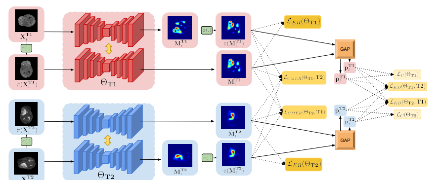 【论文标题】Weakly supervised segmentation with cross-modality equivariant constraints 【作者团队】Gaurav Patel and Jose Dolz 【发表时间】2021/04/06 【机构】普渡大学、加拿大高等理工学院 【论文链接】https://arxiv.org/pdf/2104.02488.pdf 【推荐理由】 本文出自普渡大学,目前已被 IEEE TMI 接收。作者针对当前 CAM 模块无法有效利用数据增强等变性信息的问题,提出了一种带有模态内、模态间等变约束的模型架构,并引入了 KL 散度损失促进了不同模态之间的信息交换,效果 SOTA。